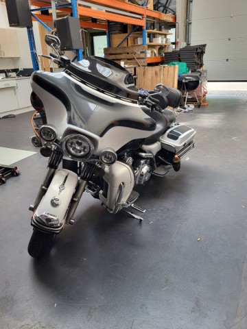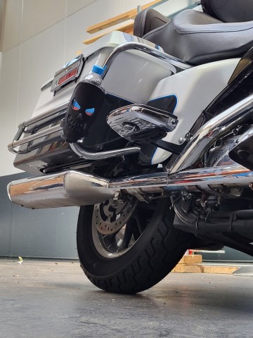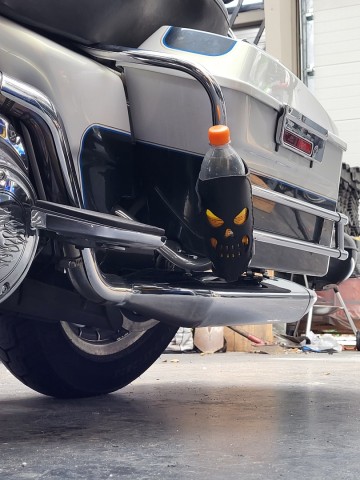 Makkelijk te monteren aan je motor of trike via 2 leren riempjes.