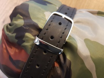 Deze lederen harnas is speciaal ontworpen voor je slaapzak of tent aan je stuur of sissybar te bevestigen.