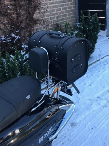 Deze Motorkoffer is makkelijk te bevestigen achter op bagagerek of achterspatbord of sissybar door middel van 4 leren riempjes.