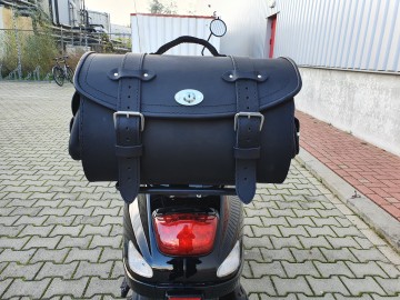 Een prachtige leren topkoffer. Deze topkoffer heeft vooral een mooie verschijning op een Vespa, motorscooter of een retroscooter.