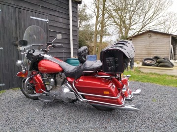 Deze Motorkoffer is makkelijk te bevestigen achter op bagagerek of achterspatbord of sissybar door middel van 4 leren riempjes. Op je motor of trike.